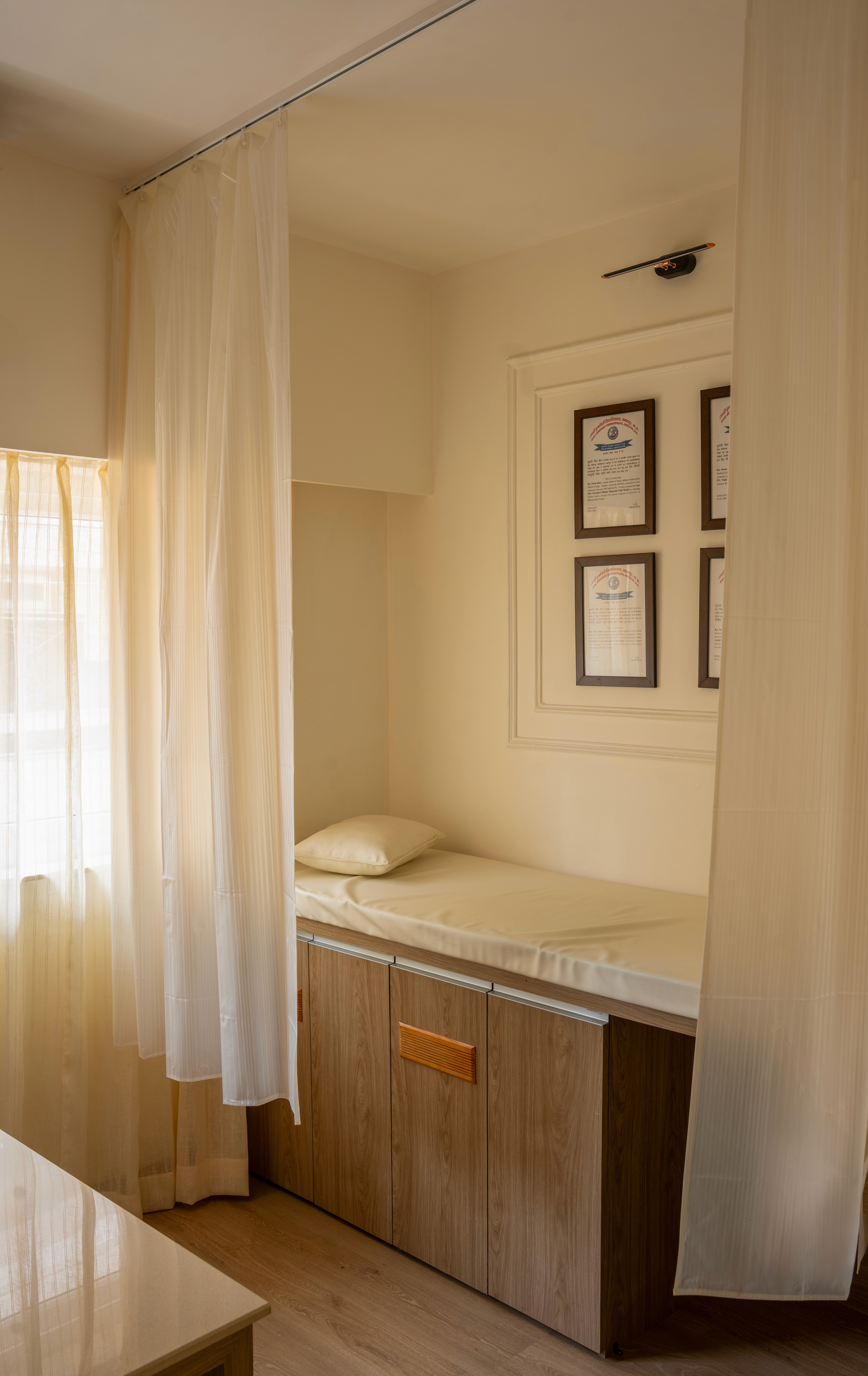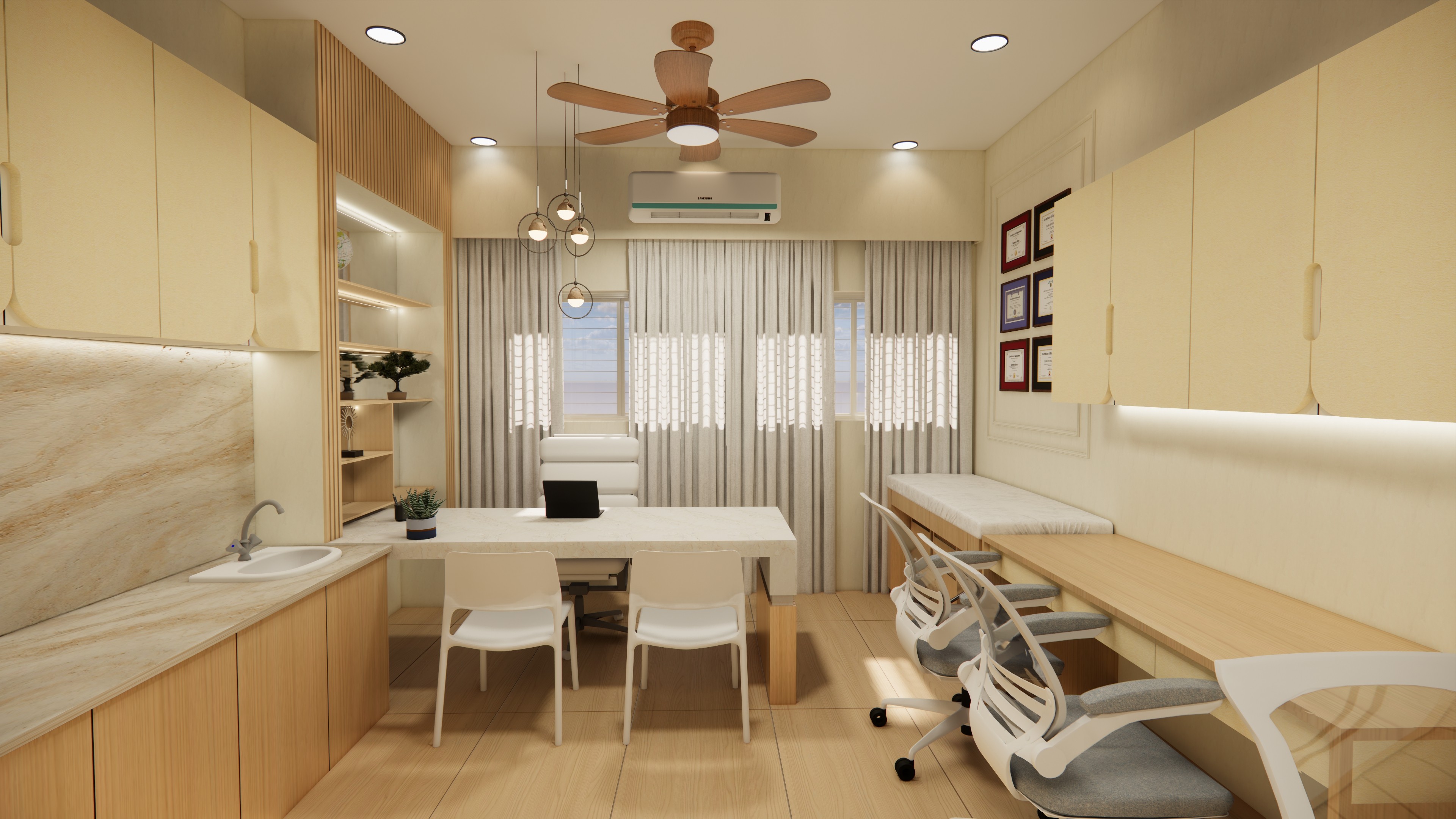 Where once pathology meant dim corners and sterile cold, We’ve brought in warmth — the hush of wood, the glow of cream and gold. Lamps that cast calm, textures that breathe ease, A space where clarity meets quiet, and care is felt in every piece.